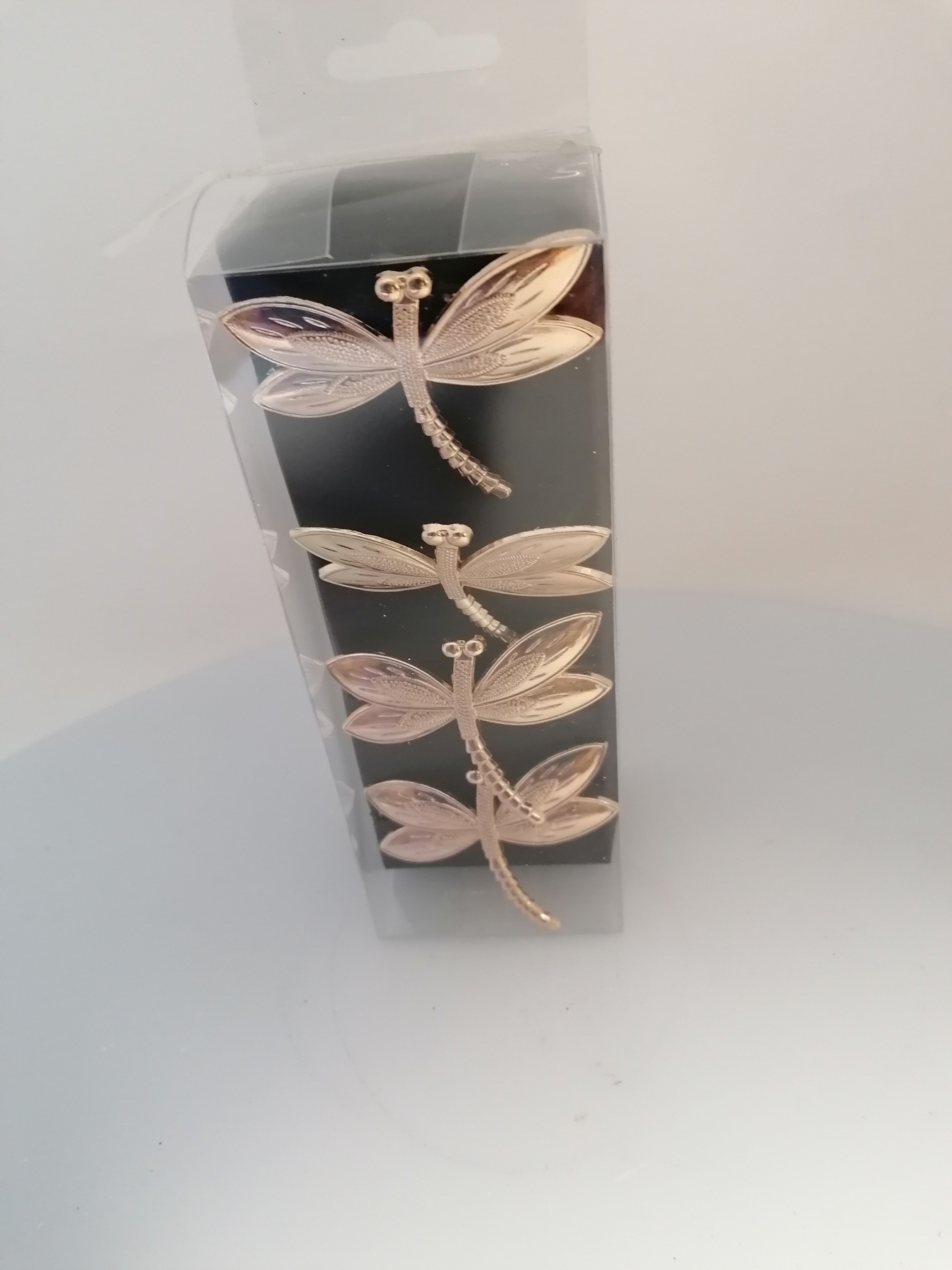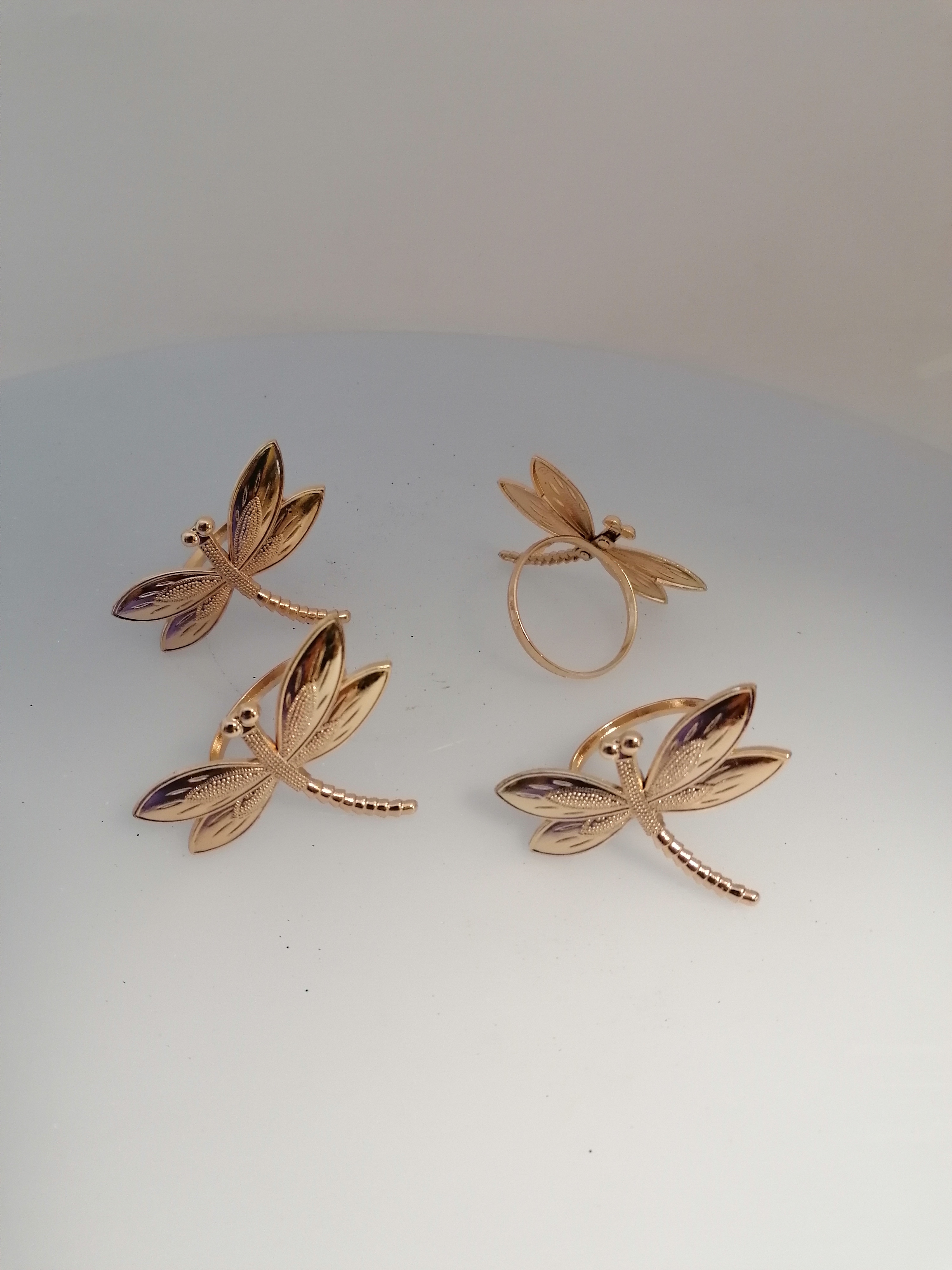 4 ozdobné pracky na obrúsky s dekorom vážky, ktoré sú vyrobené z vysoko kvalitnej nerezovej ocele. Majú  luxusný zlatý dizajn preto sú štýlovým doplnkom pre slávnostnú atmosféru.  Cena za balenie.