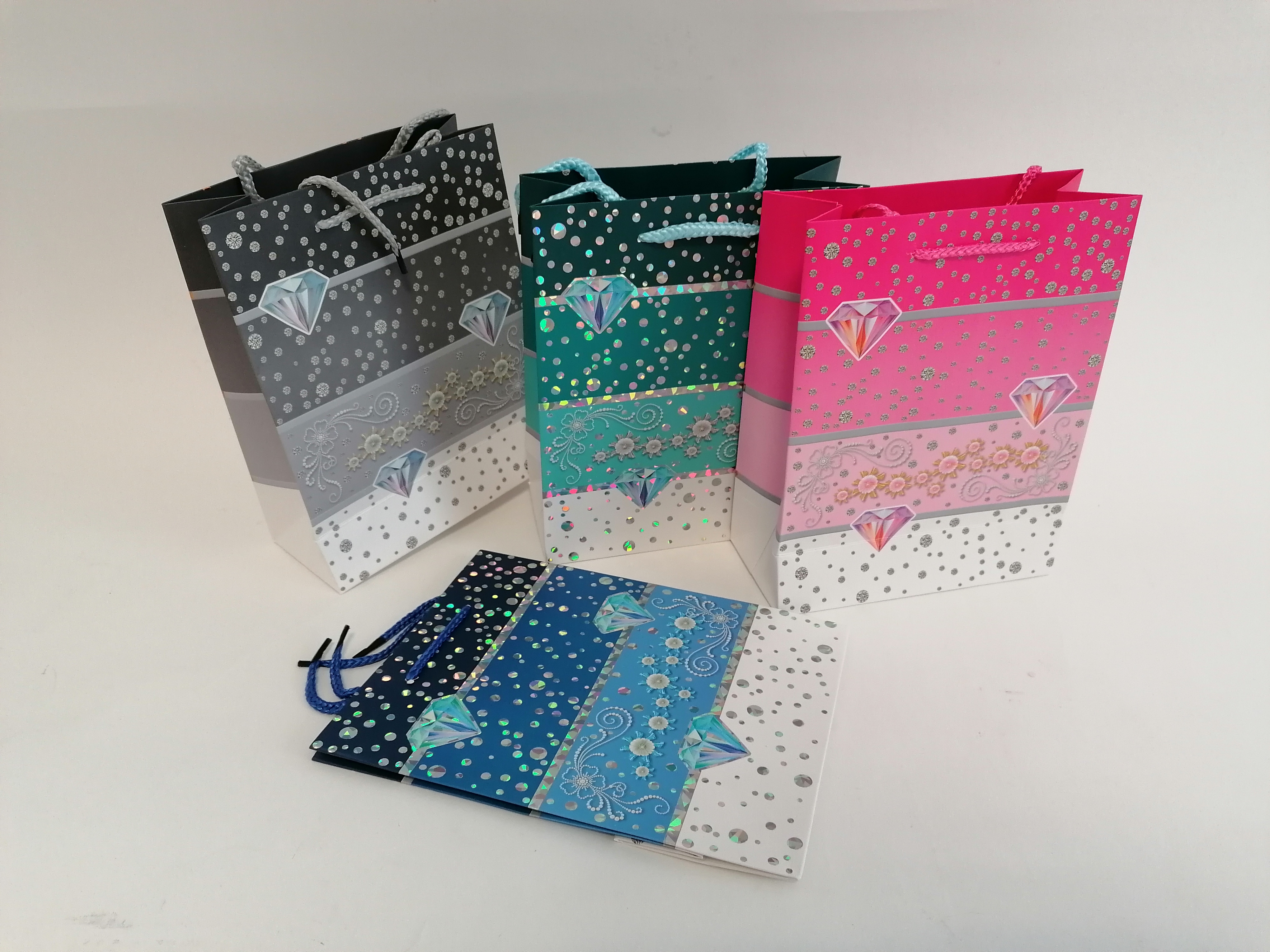 Balenie darčekových papierových tašiek s kryštálikmi vo rôznych farbách. Taška je vhodná na zabalenie darčekov. V balení sa nachádza 12ks. Cena je za balenie.