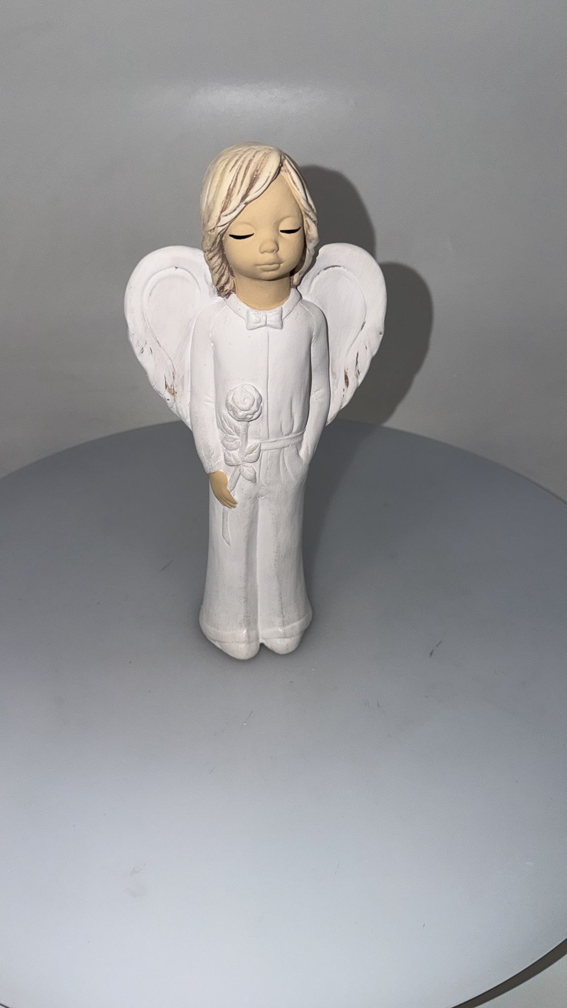 Dekoračný anjel chlapca s ružou, sádrový, bielo-strieborný.