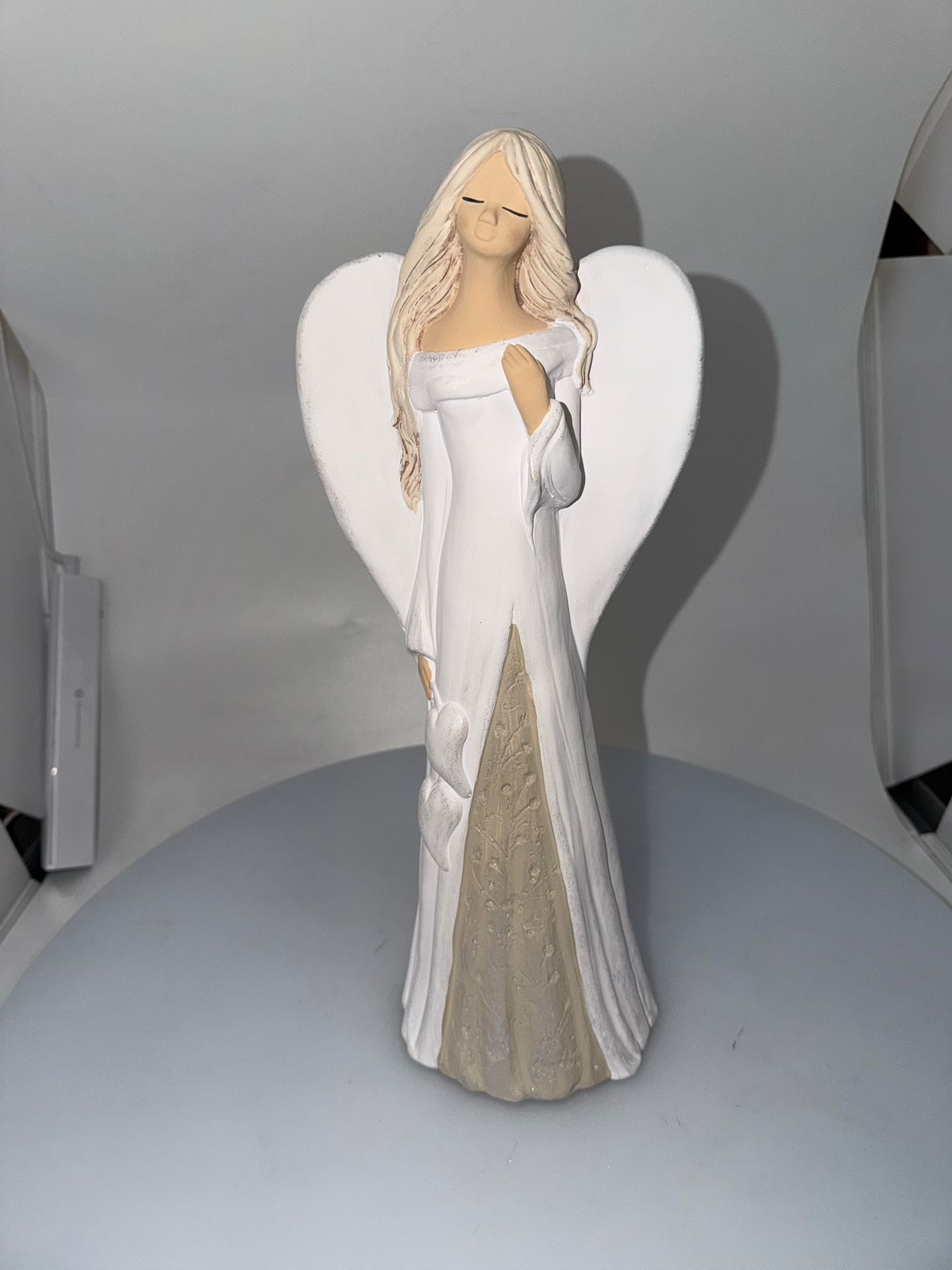 Dekoračný sádrový anjel, MAJA srdce, biela-olivová, 36x13 cm