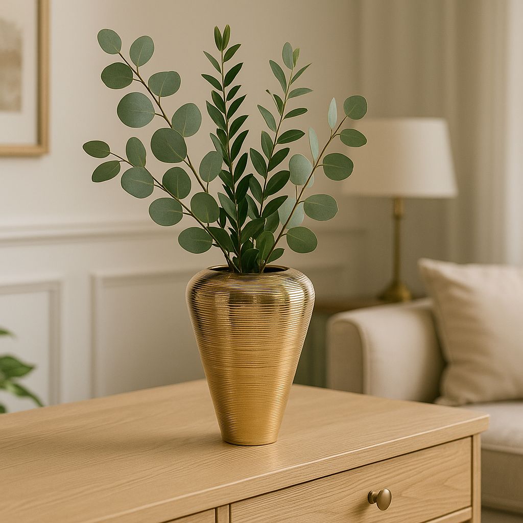 Zlatá keramická váza, vhodná ako dekorácia do interiéru a teplého exteriéru.