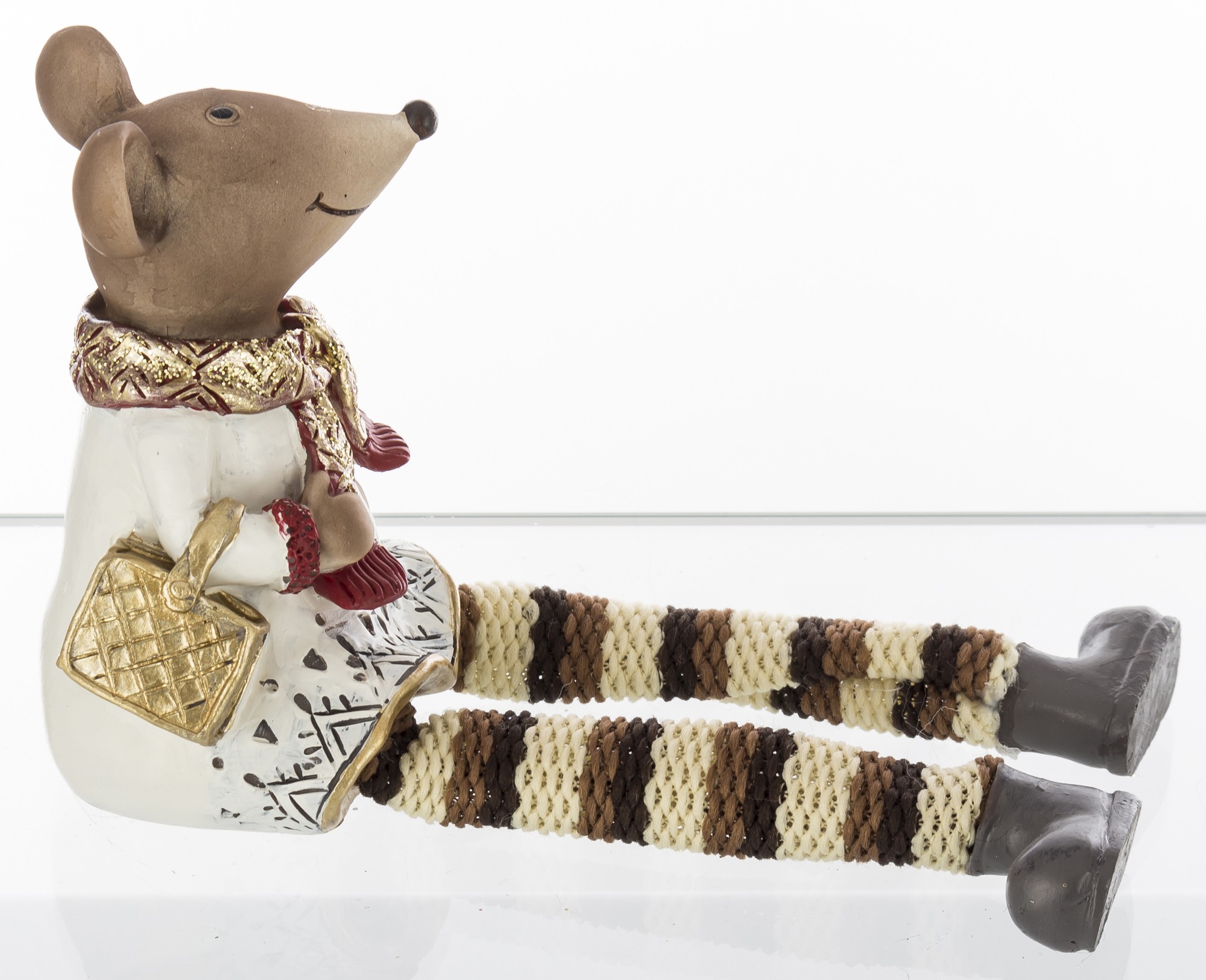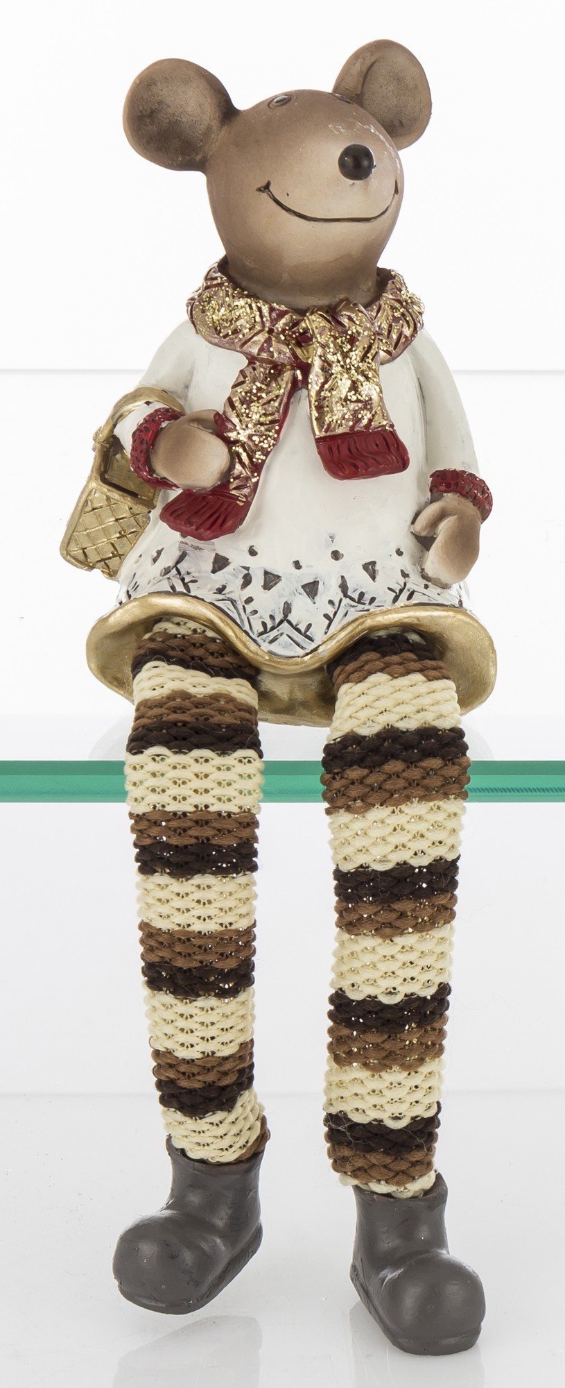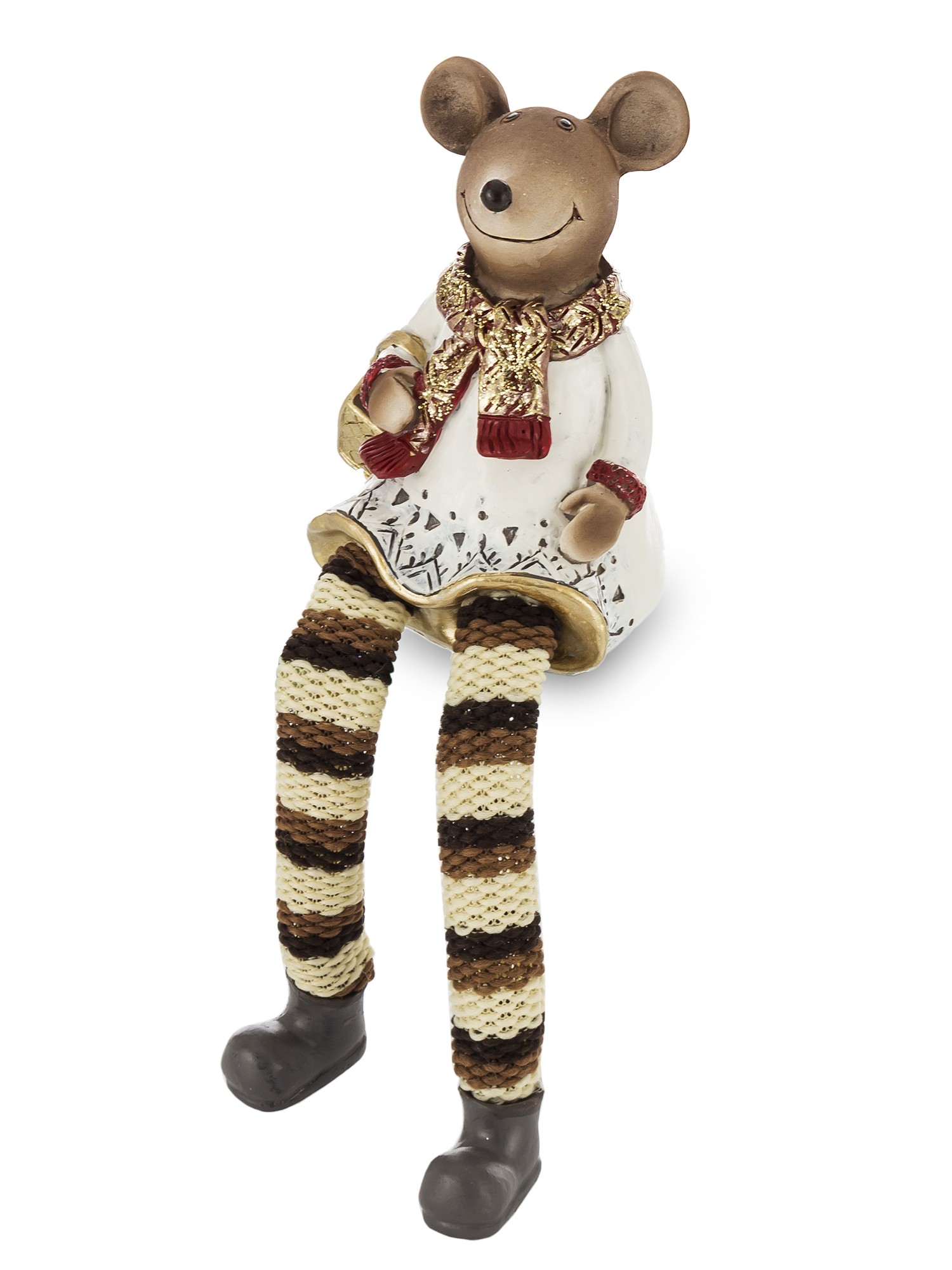 Dekoračná figúrka myšky s visiacimi nohami v zimnom oblečení. Svojim kreatívnym vianočným štýlom poskytuje inšpiráciu na výzdobu vášho domova na Vianoce, alebo vianočných ikebán.