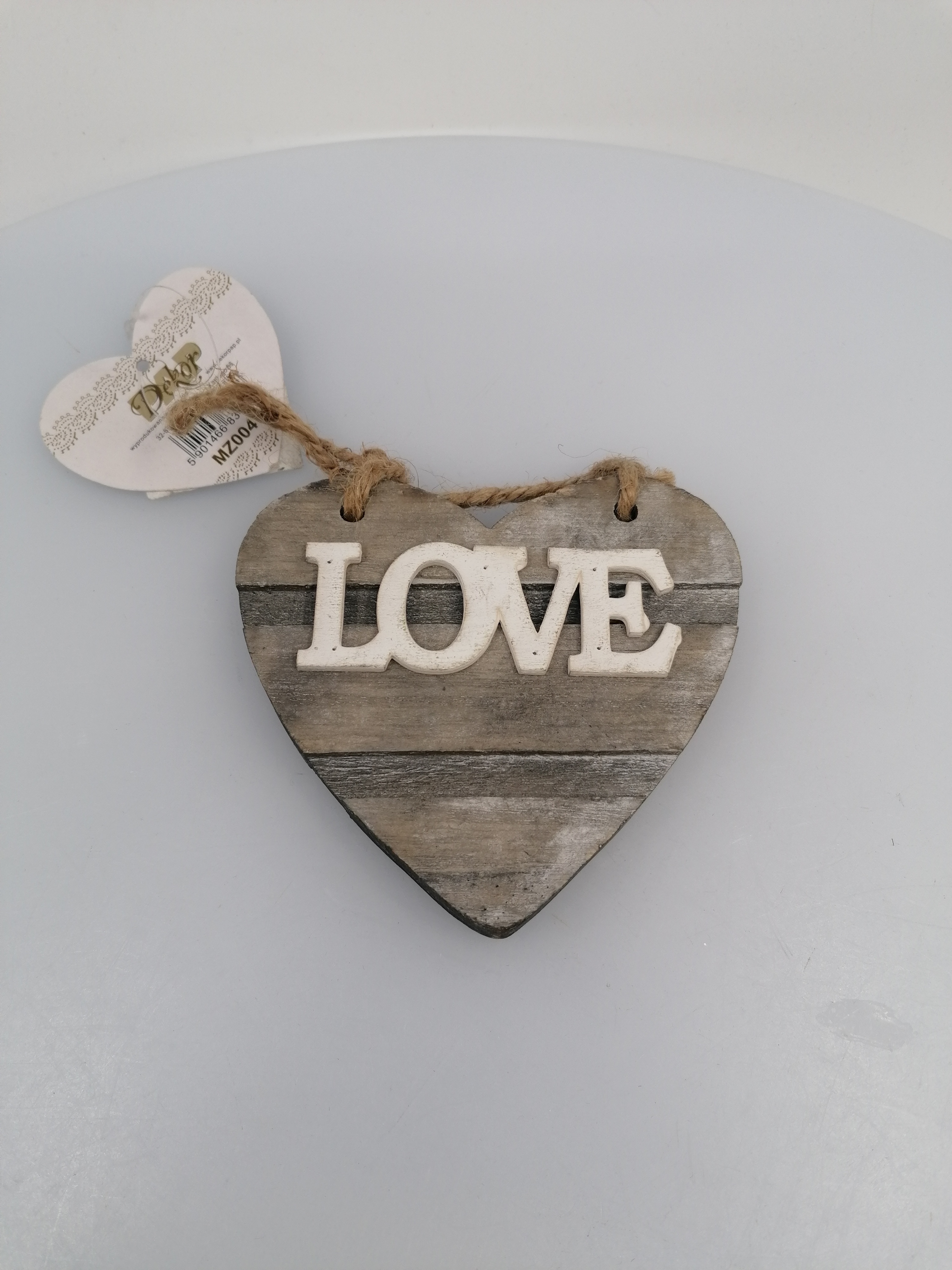 Dekoračný drevený prívesok v tvare srdca s bielym nadpisom LOVE.  Vhodný na aranžovanie pri rôznych príležitostiach.