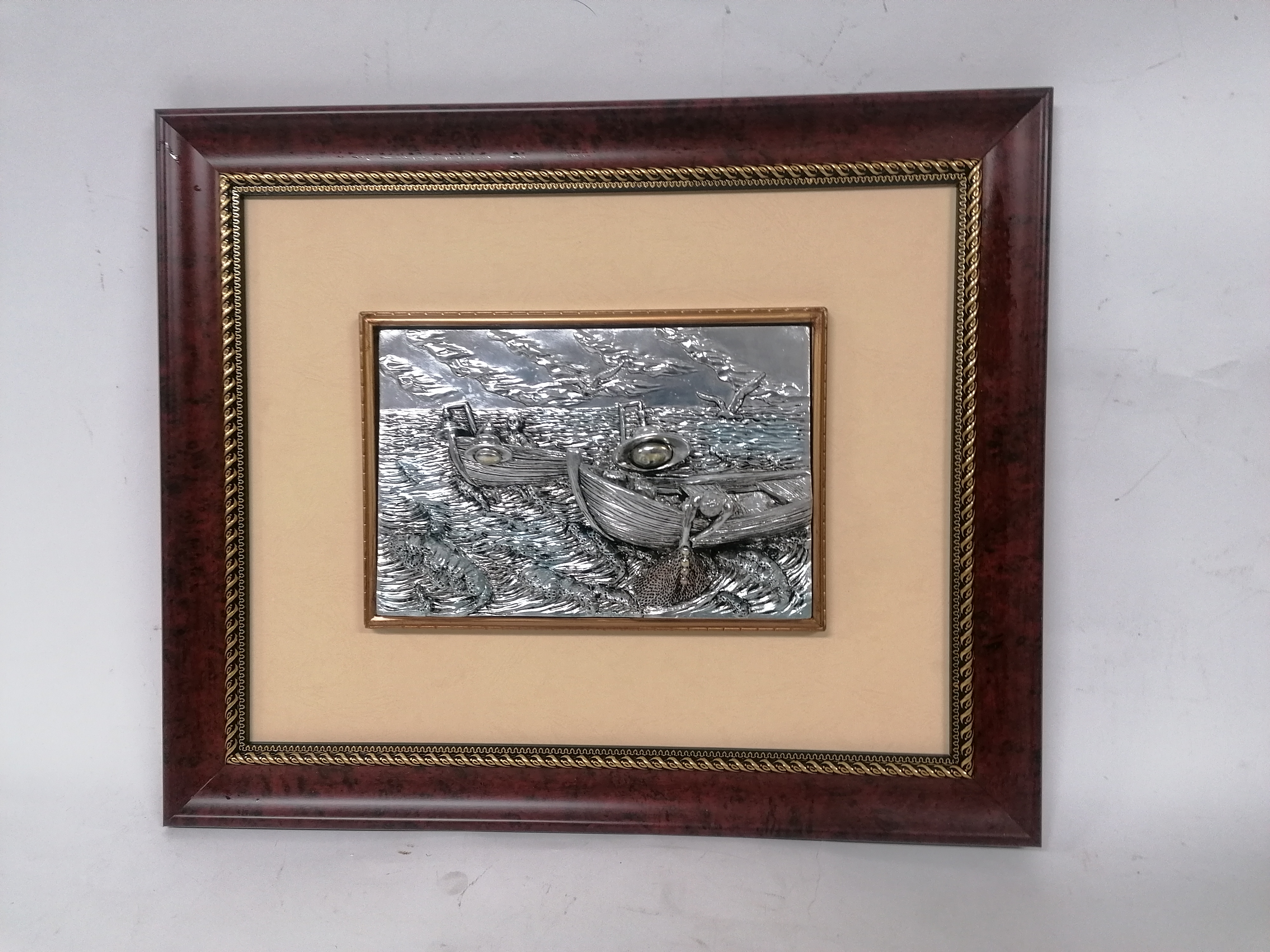 Luxusný trojrozmerný reliéfny obraz člnu v striebornom prevedení.  Obraz jeden z mnohých originálnych dizajnov vhodný ako  dekorácia stien v každom interiéri. Obraz s plastovým rámom je pripravený na zavesenie. V ponuke sú aj iné luxusné obrazy.