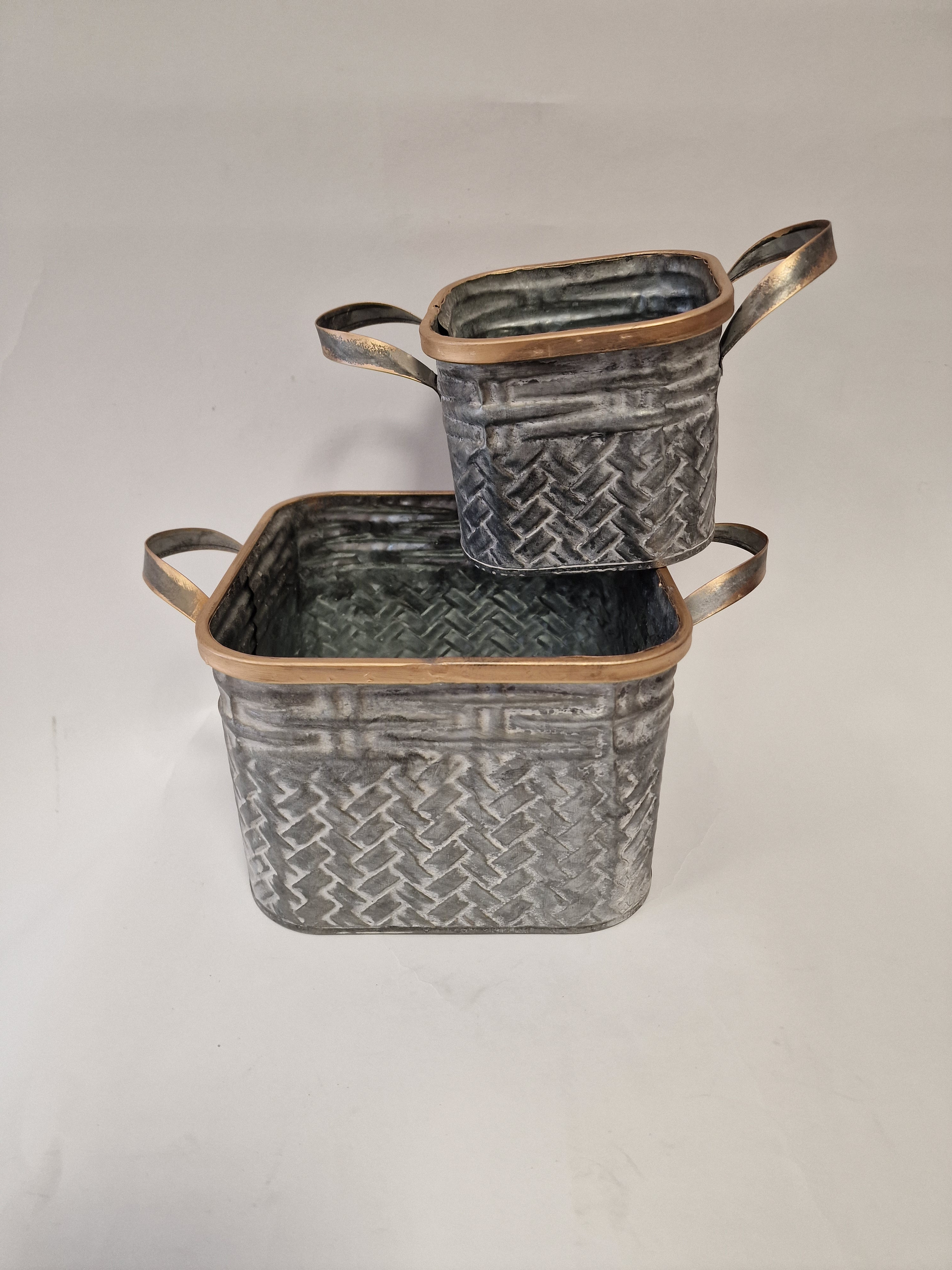 • Plechová nádoba, strieborná s uškami so zlatým okrajom, 2 ks v sade, vhodná na aranžovanie a dekorovanie do interiéru aj exteriéru