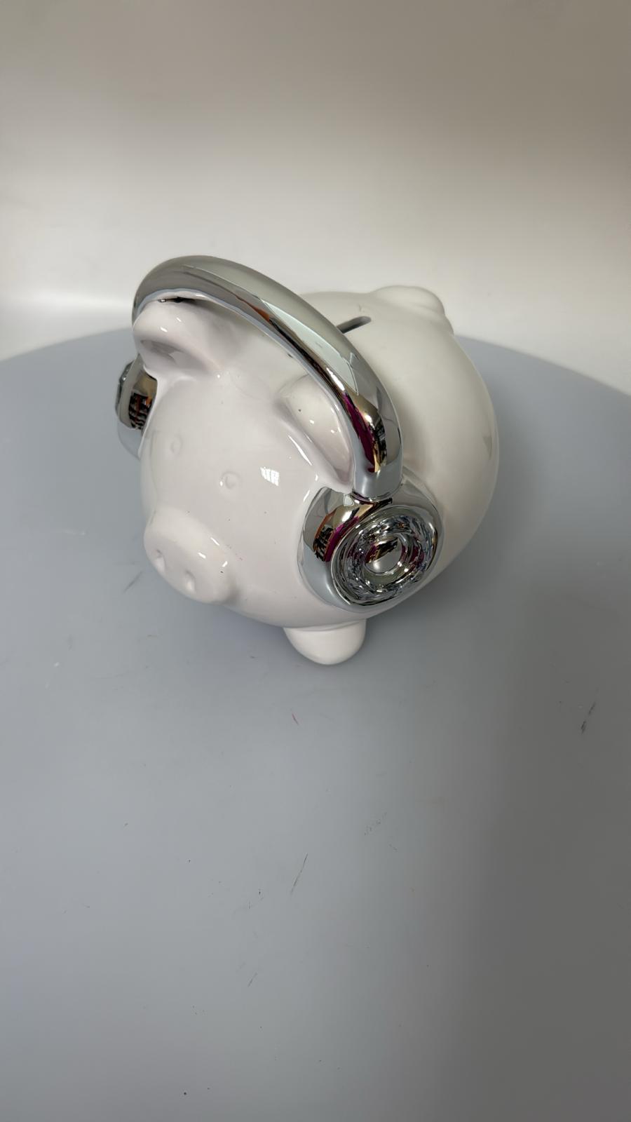 Pokladnička, prasiatko, biela so striebornými slúchatkami.