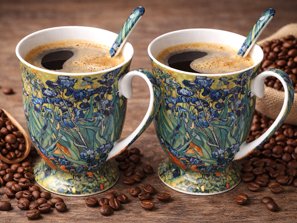 Sada dekorovaných hrnčekov s lyžičkami. Hrnčeky sú prevedené v krásnom kvetinovom vzore.