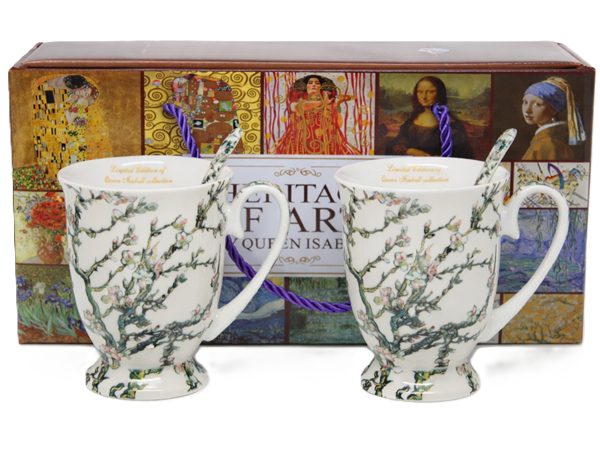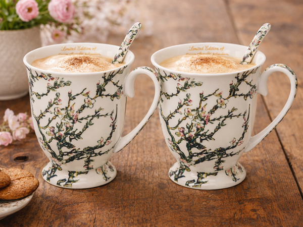 Sada dekorovaných hrnčekov s lyžičkami. Hrnčeky sú prevedené v krásnom kvetinovom vzore.