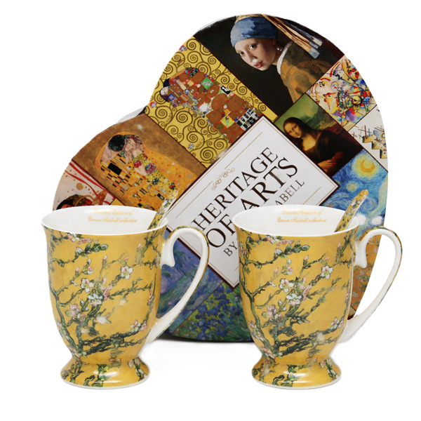Sada dekorovaných hrnčekov s lyžičkami. Hrnčeky sú prevedené v krásnom kvetinovom vzore.