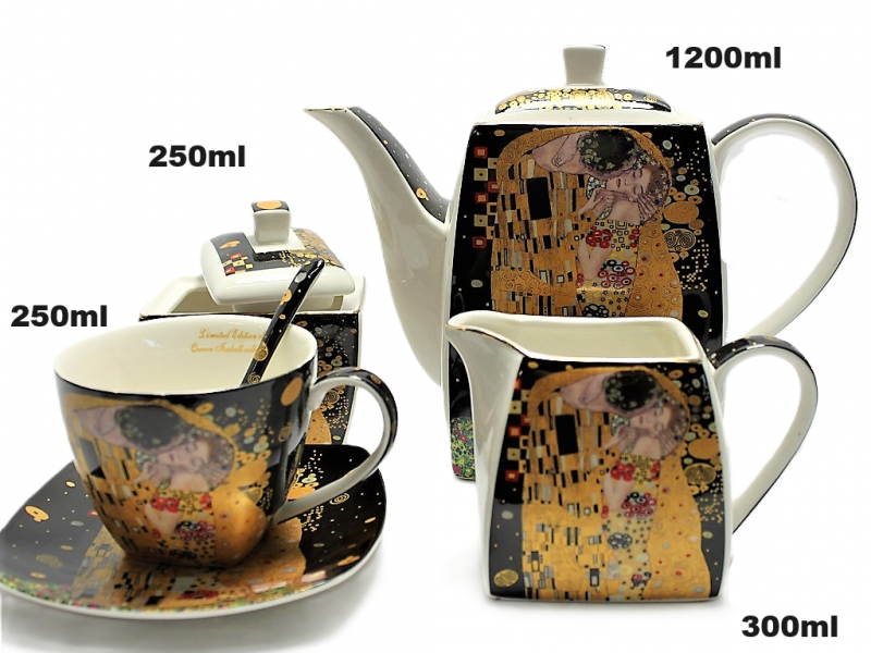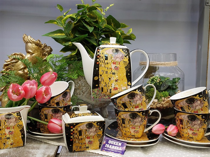 Súprava šálok na kávu - S radosťou vám predstavujeme našu jedinečnú súpravu šálok na kávu, ktorá pozostáva zo 6 šálok s lyžičkami, kanvičky, cukorničky a kanvičky na mlieko. Všetky prvky súpravy sú vyrobené z najkvalitnejšieho kostného porcelánu, ktorý zaručuje odolnosť a elegantný vzhľad. Kostný porcelán je druh porcelánu, ktorý sa vyznačuje veľmi vysokou kvalitou a odolnosťou. Ide o materiál, ktorý vznikol spojením rôznych druhov hliny a zvieracích kostí, čo mu dodáva výnimočnú tvrdosť a jemnosť. Naše šálky z kostného porcelánu sú zárukou najvyššej kvality a elegantného štýlu. Na porcelán sme vytlačili fragment obrazu Bozk od Gustava Klimta. Ide o mimoriadne krásny a rozpoznateľný motív, ktorý vnesie do vášho interiéru nádych umenia. Súprava bola vyrobená špeciálne pre spoločnosť Queen Izabell, čo potvrdzuje jej jedinečnosť a neopakovateľný charakter. Sada šálok na kávu je zabalená v ozdobnej krabičke s rovnakými vzormi ako na porceláne. Toto je ideálny tip na darček pre znalcov kávy a milovníkov umenia. Naša súprava šálok s lyžičkami, kanvičkou, cukorničkou a kanvičkou na mlieko je perfektnou ponukou pre ľudí, ktorí si cenia nielen chuť kávy, ale aj elegantný štýl a estetiku.
