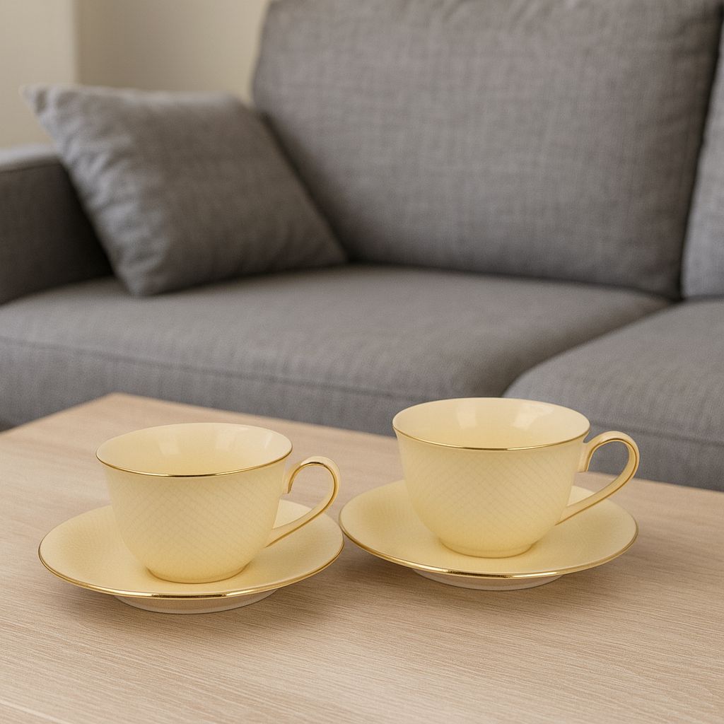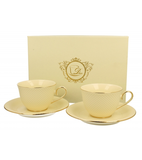Sada dvoch šálok a podšálok VESPER zo série ECRU Exclusive, vyrobená z porcelánu New Bone China v jemnej ecru farbe, ktorá sa vyznačuje jemným leskom a výnimočnou pevnosťou a odolnosťou, pričom si zachováva ľahkosť a jemnosť.