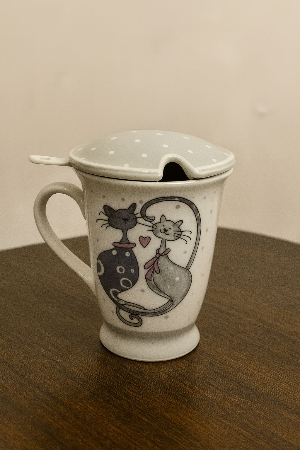 Šálka s podšálkou zaparovačom a lyžičkou, Mačky.