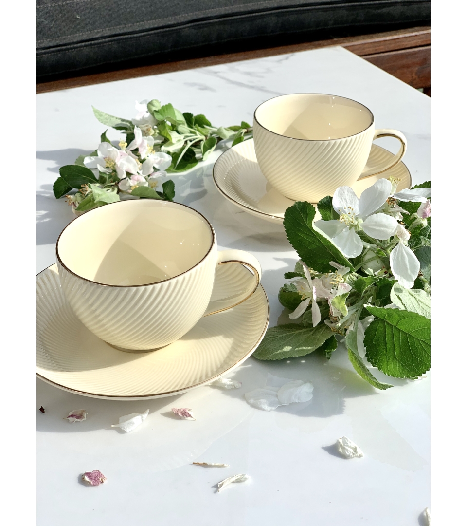 Elegantná sada dvoch porcelánových šálok s podšálkou vysokej kvality s 3D vzorom vĺn na béžovom podklade, ktoré sú doplnené zlatým lémom. Sada je balená v darčekovej krabičke. Šálka je vhodná do umývačky riadu. Neodporúča sa do mikrovlnnej rúry.
