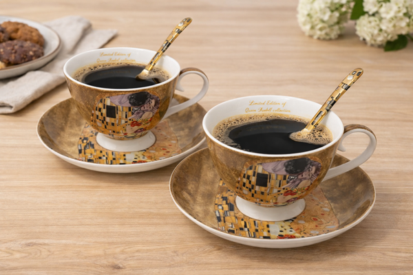 Sada dvoch 230 ml šálok s podšálkami THE KISS Classic inšpirovaných Gustavom Klimtom, súčasť série Art Gallery, vyrobené z porcelánu New Bone China, ktorý sa vyznačuje elegantnou a prírodnou krémovo bielou farbou s jemným leskom a zároveň výnimočnou odolnosťou.