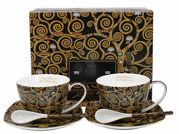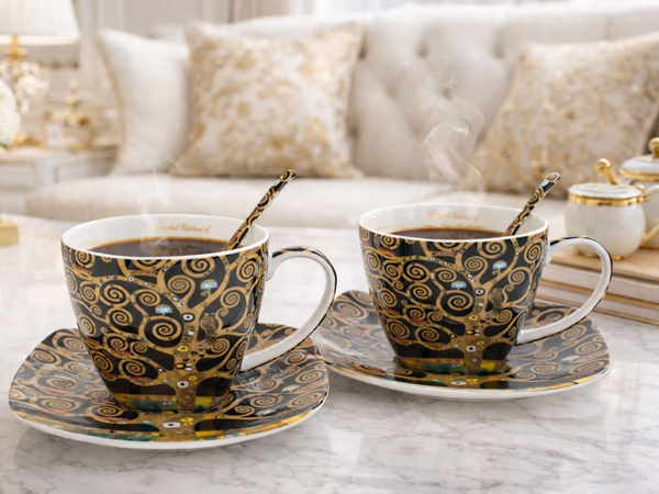 Sada dvoch 300 ml šálok s podšálkami vo verzii TREE Classic inšpirovaných Gustavom Klimtom, súčasť série Art Gallery, vyrobené z porcelánu New Bone China, ktorý sa vyznačuje elegantnou a prírodnou krémovo bielou farbou s jemným leskom a zároveň výnimočnou odolnosťou.