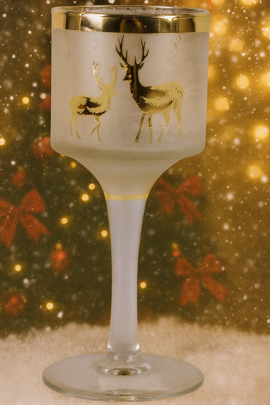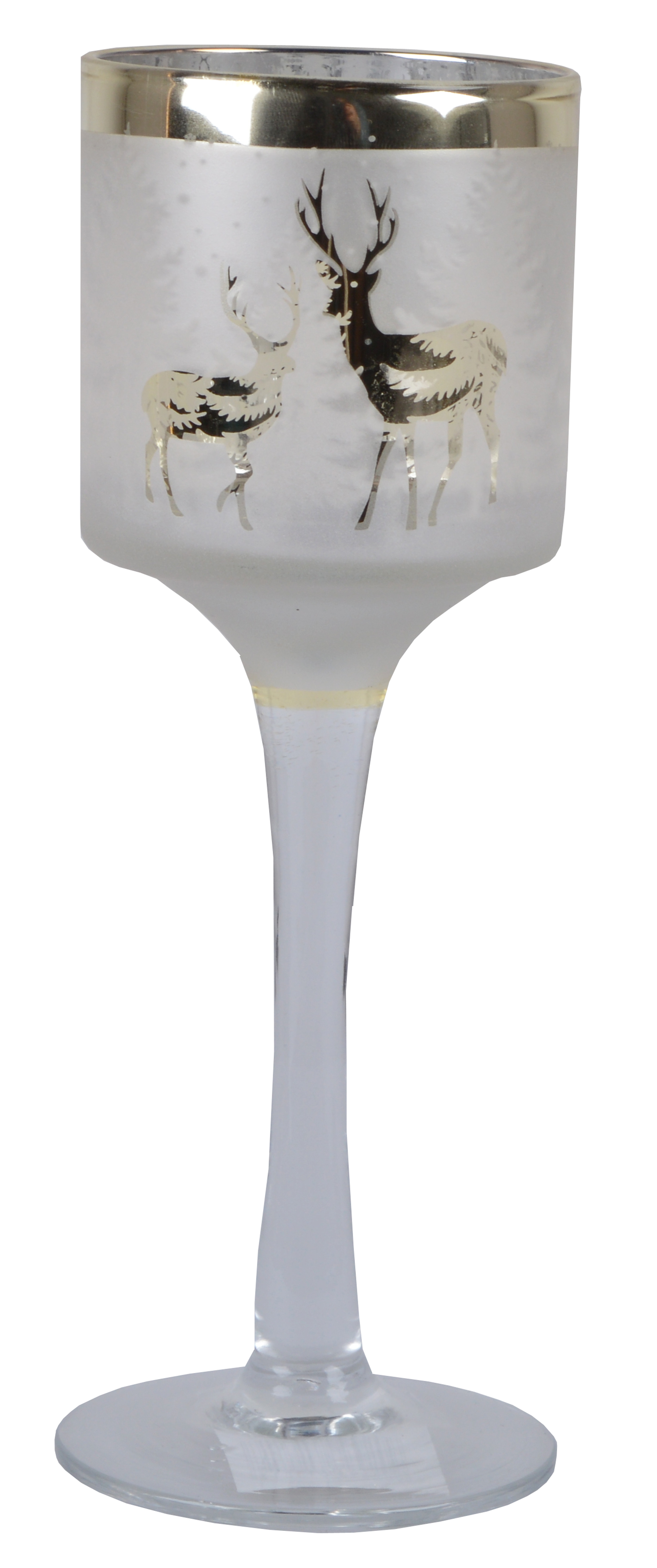 Dekoračný svietnik na podstavci z matného skla s vianočným dekorom a so zlatým lemom. Vhodný aj ako vianočná interiérová dekorácia.