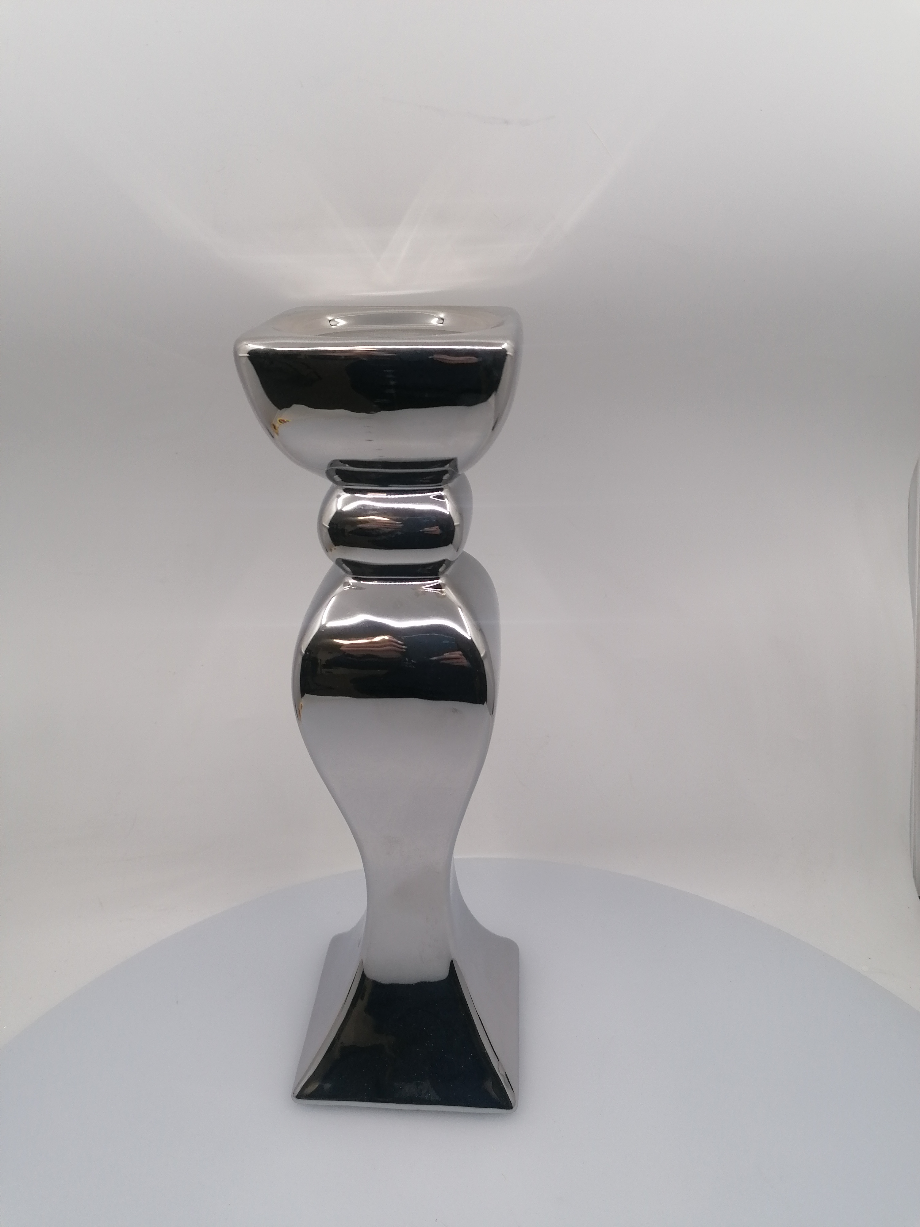 Strieborný keramický dekoračný svietnik v jednoduchom štýle. Svojim strieborným dizajnom v kombinácií so sériovými doplnkami poskytuje inšpiráciu na slávnostnú výzdobu vášho domova alebo salónov.