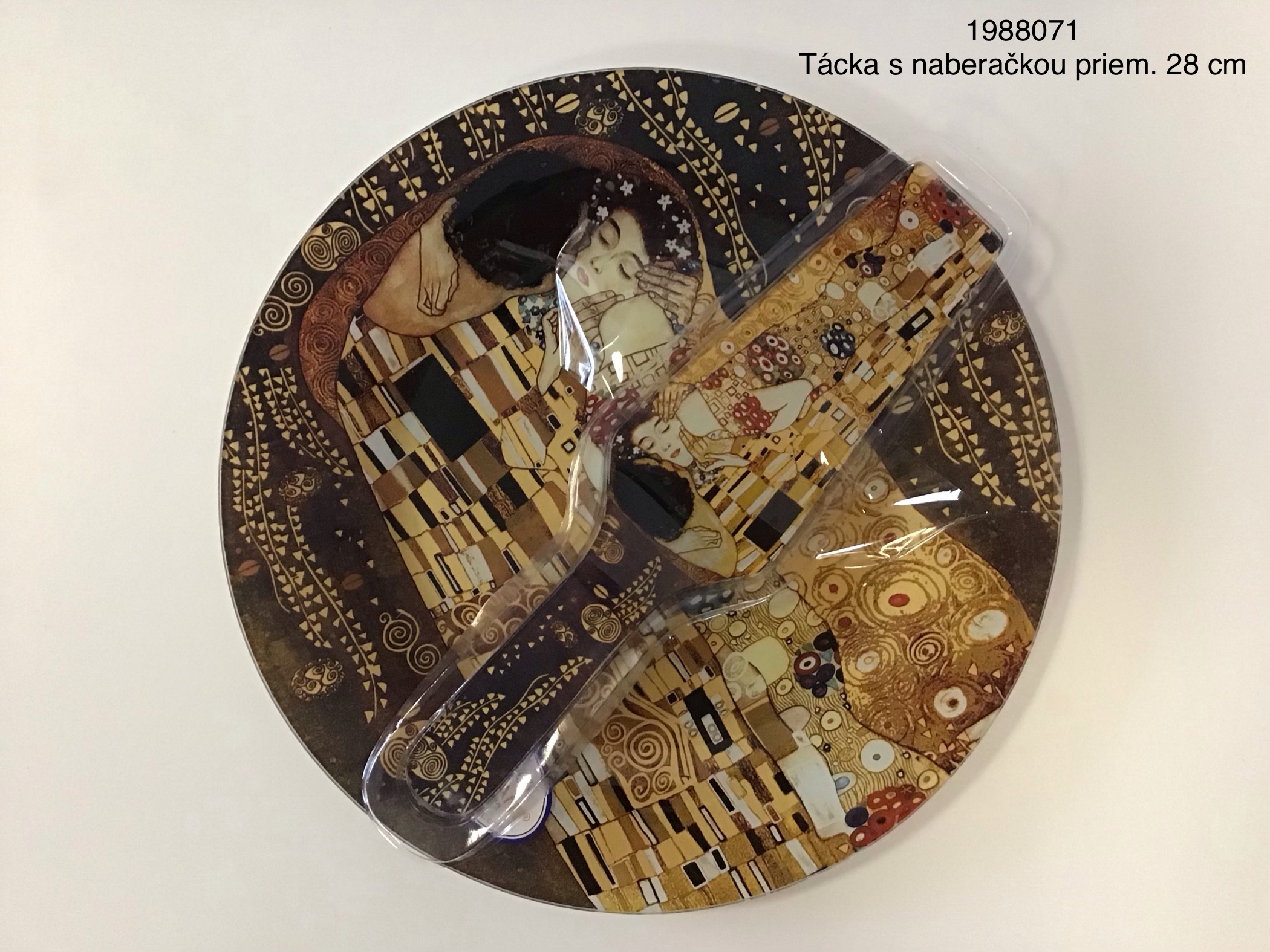 Okrúhla sklenená tácka s maľbami The Kiss z kolekcie Gustáva Klimta. V darčekovej krabičke. Tácka kombinuje funkciu praktickú na servírovanie jedla, ako aj estetickú ako dekorácia.