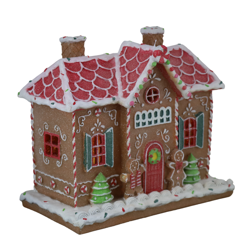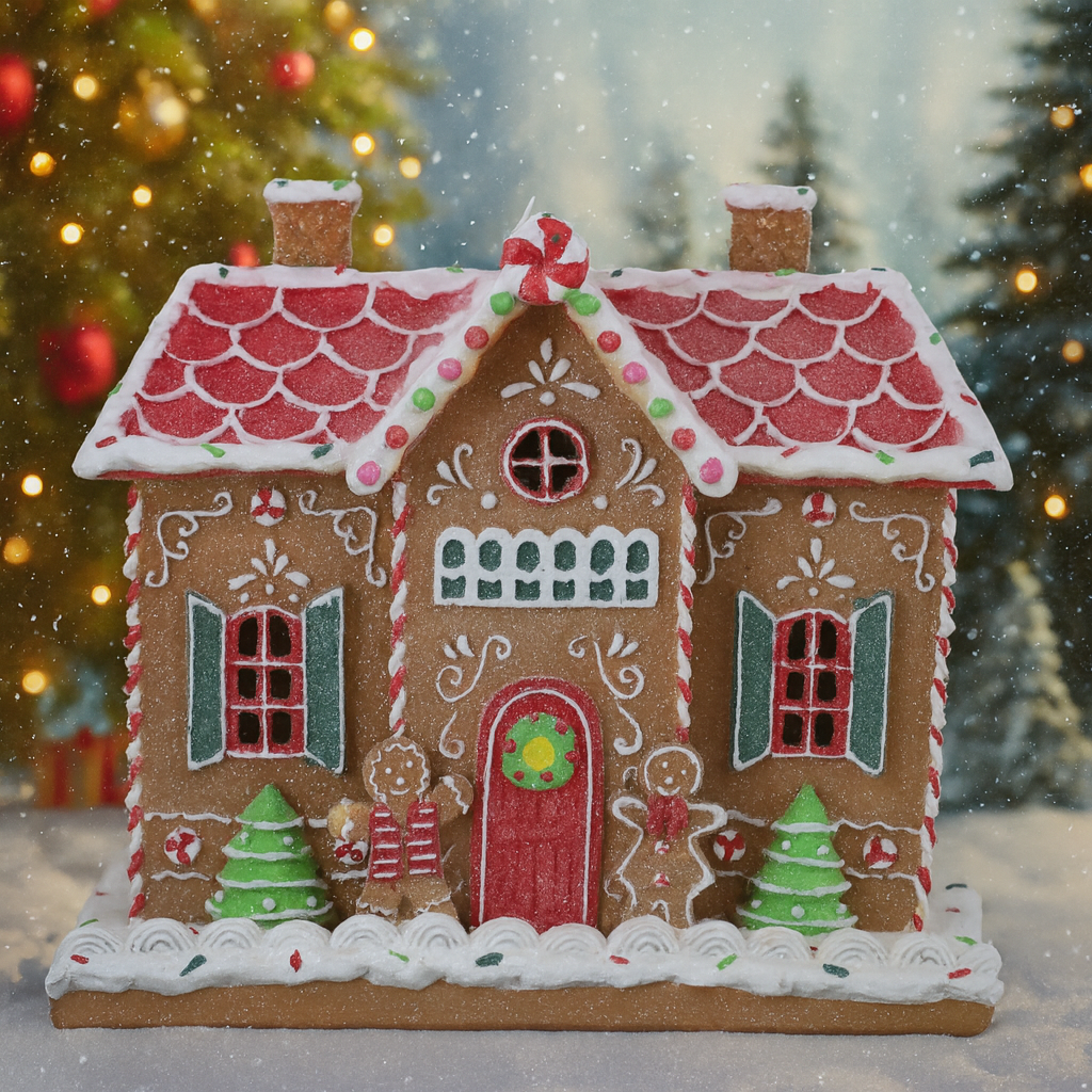 Vianočný dekoračný domček, perníkový, dekorovaný, LED. Svieti a hrá hudba.2 batérie AA. Batérie nie sú súčasťou balenia.