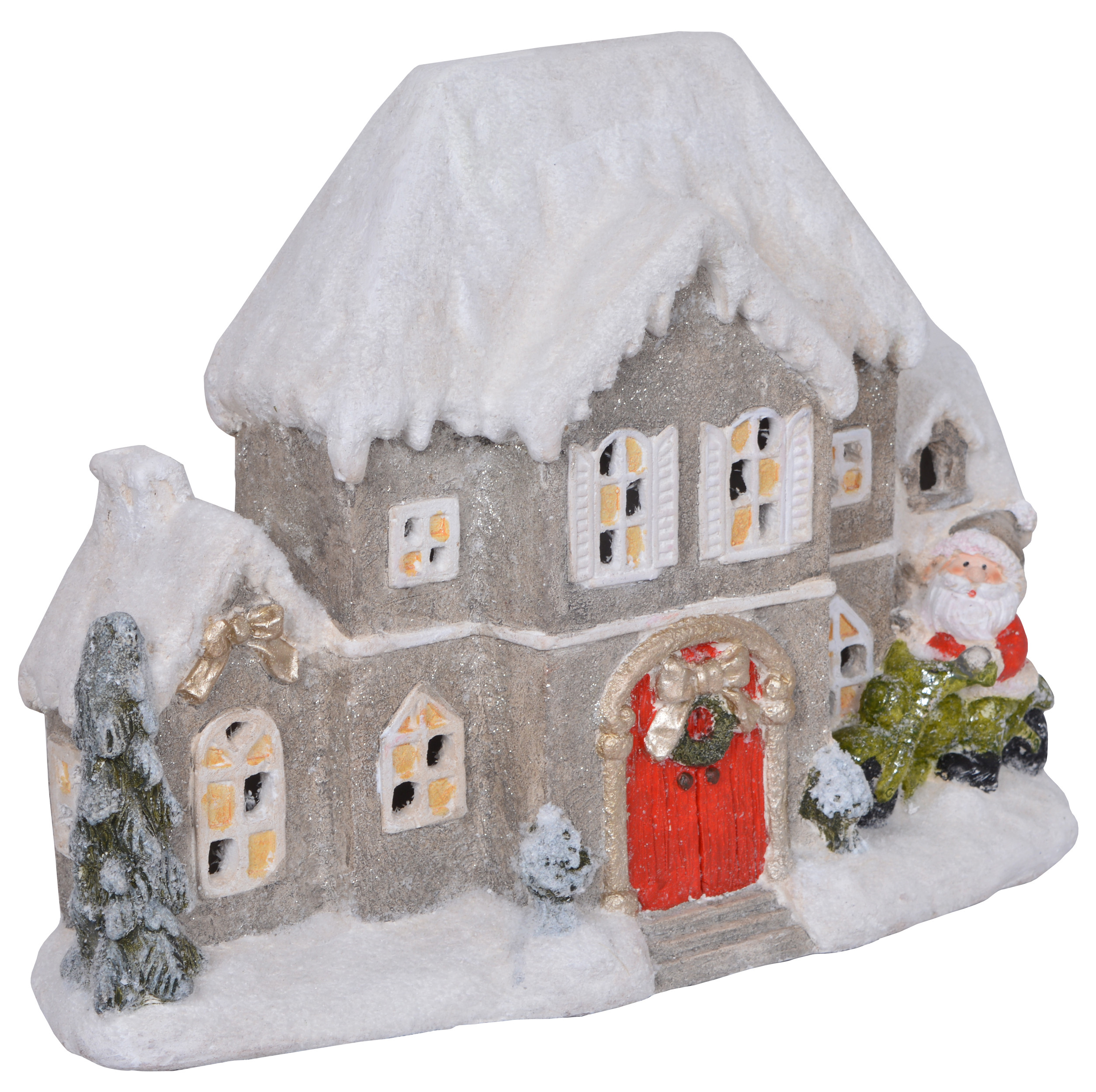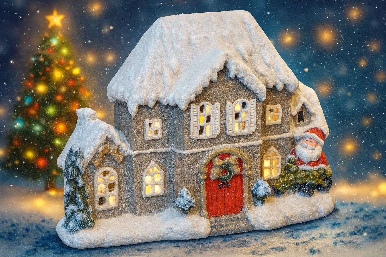 Vianočný dekoračný domček, svetlý, keramika, LED. Svieti a hrá hudba.3 batérie AA. Batérie nie sú súčasťou balenia.