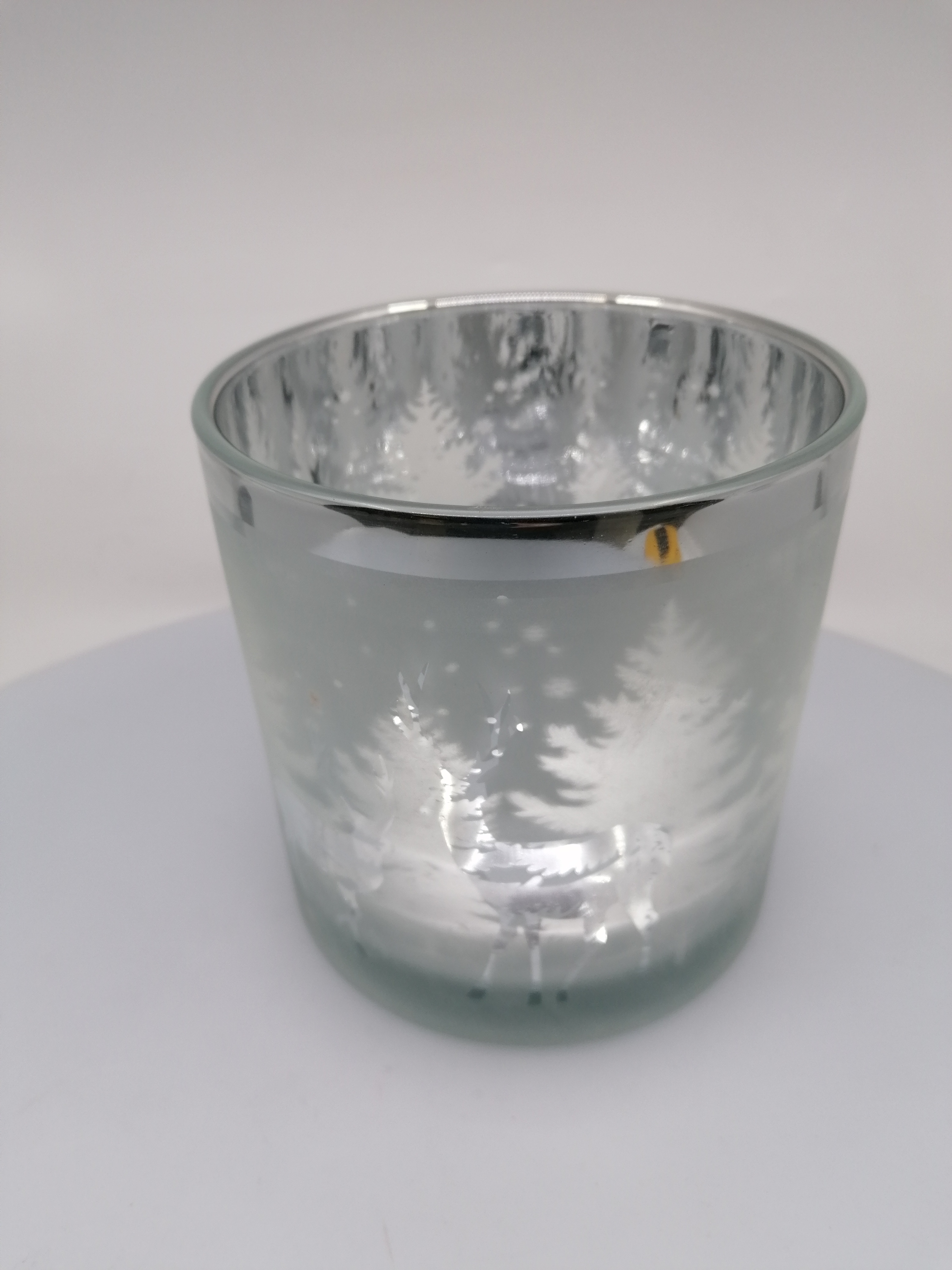Dekoračný svietnik z matného skla s vianočným motívom a so strieborným lemom. Vhodný aj ako vianočná interiérová dekorácia.