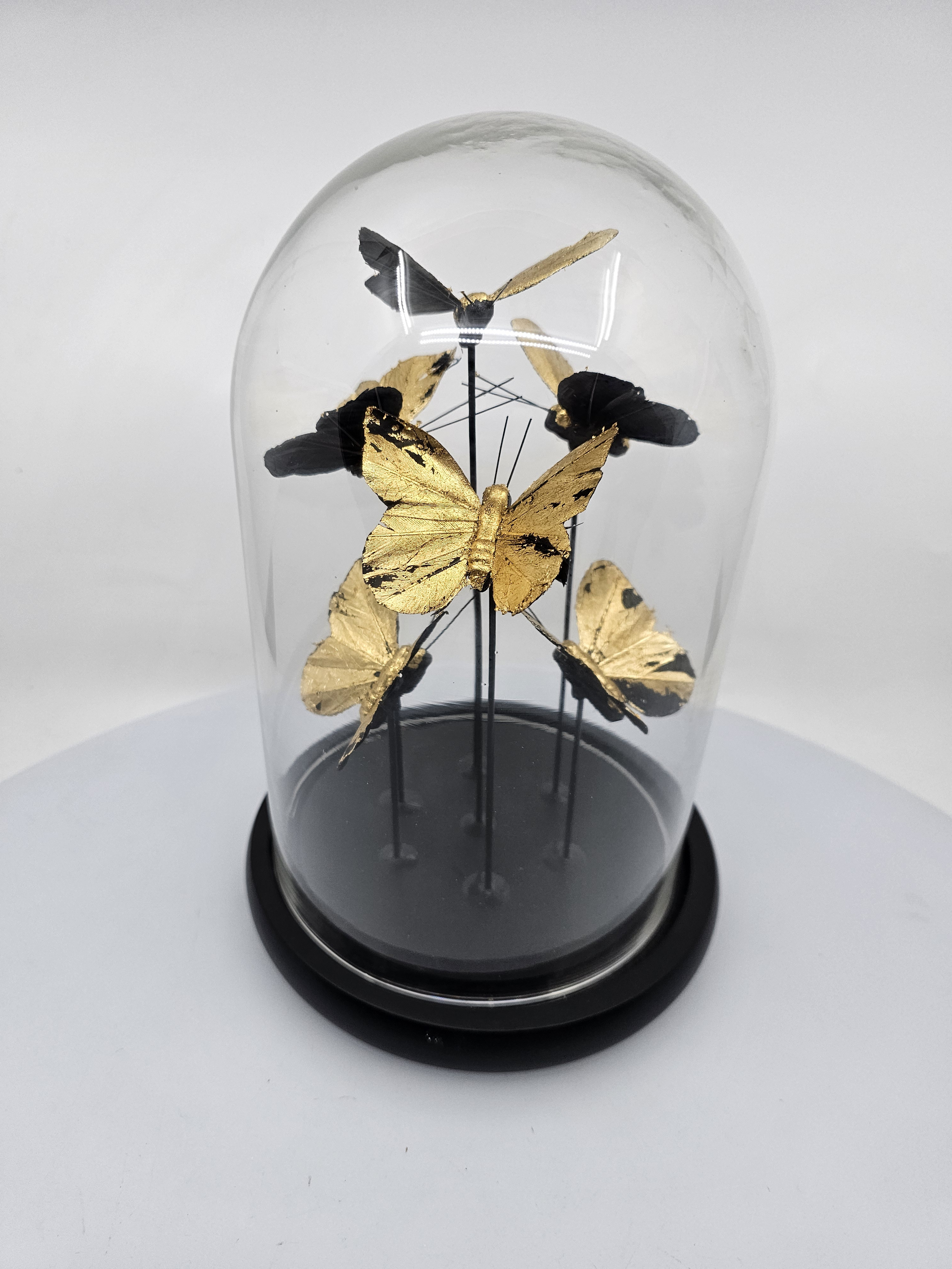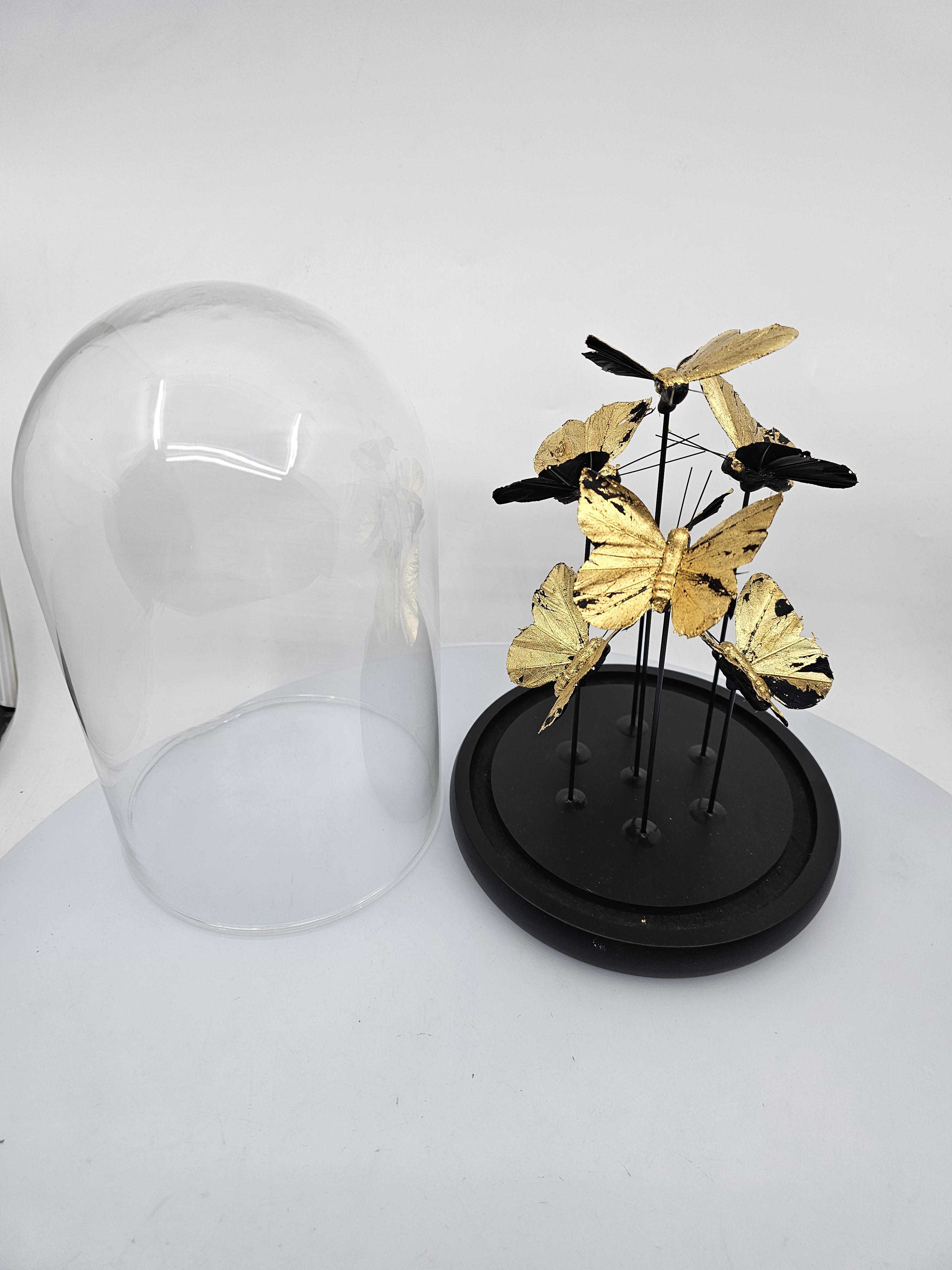Ponúkam jedinečnú dekoráciu v podobe zlatých motýľov na drevenom podstavci, prekrytú sklenenou kupolou. Starostlivo vyrobené detaily krídel zdôrazňujú jemnosť a krásu motýľov, vytvárajúc trojrozmerný dekoračný efekt Je to elegantný a jedinečný dekoratívny prvok, ktorý dodá každému interiéru eleganciu a šarm.